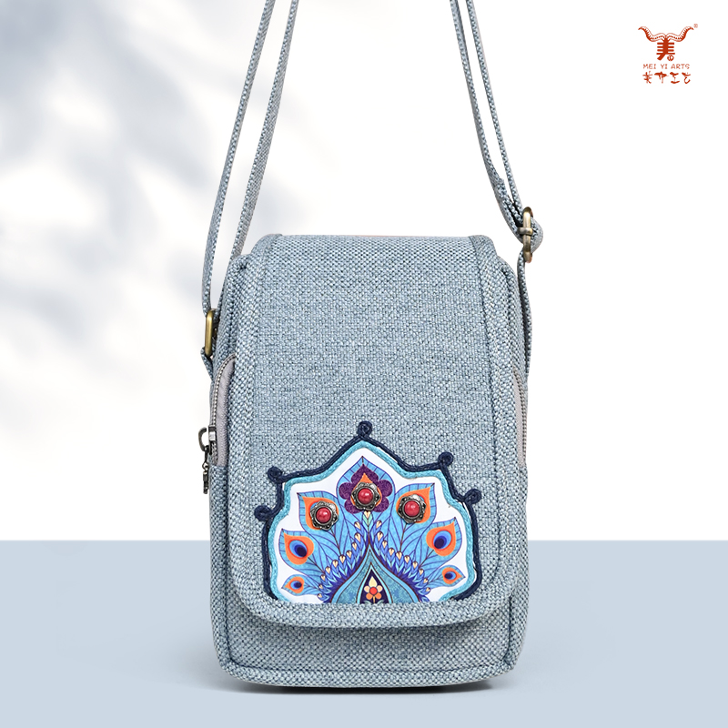 Mei Yi Arts 孔雀印花亞麻風格翻蓋斜背包